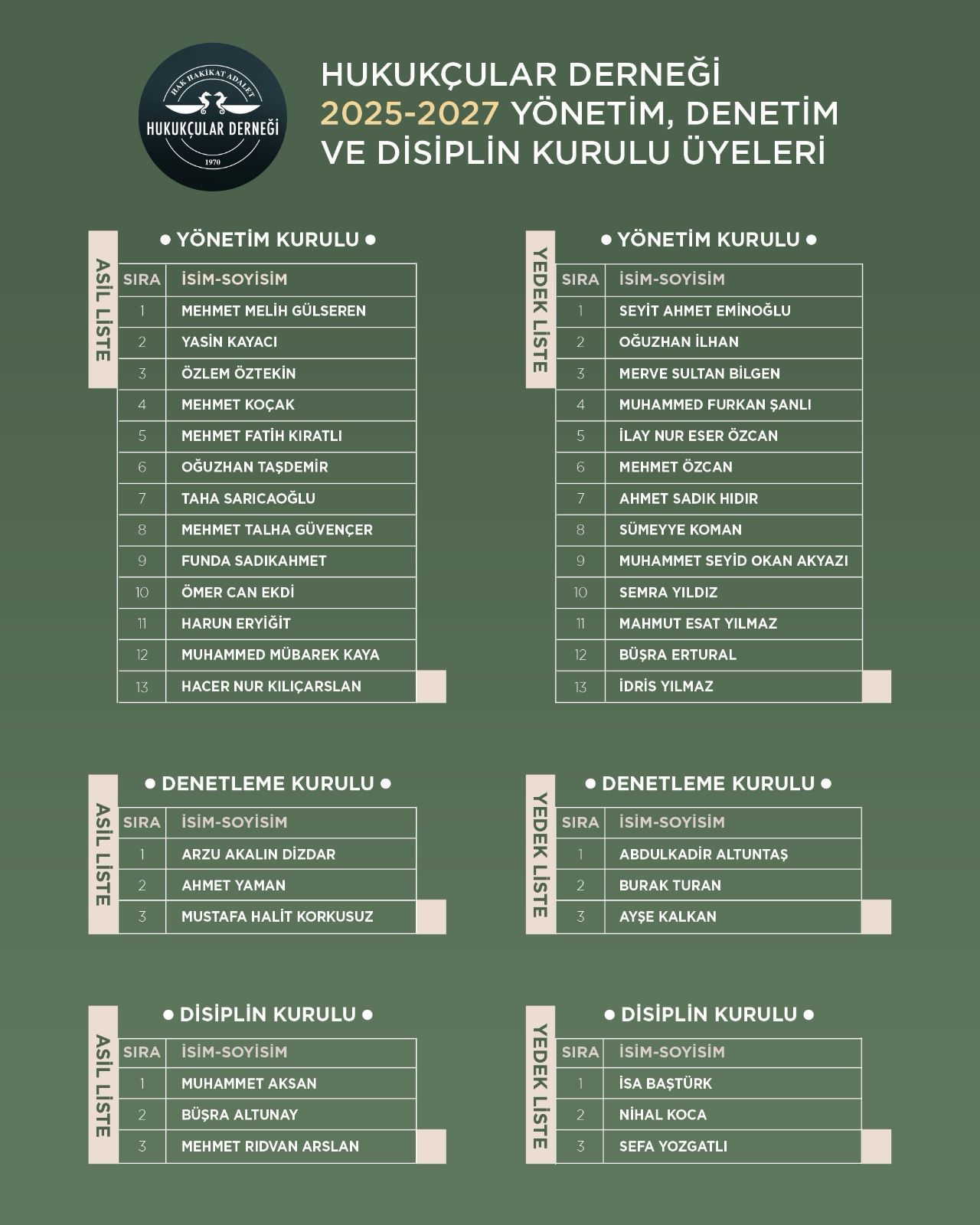 Hukuki vizyon, adalet ve mesleki dayanışma ilkeleri doğrultusunda çalışmalarını yürütecek olan tüm kurul üyelerimize, 2025–2027 faaliyet dönemi boyunca gerçekleştirecekleri hizmetlerde üstün başarılar ve kolaylıklar diliyoruz.